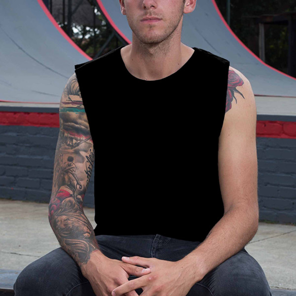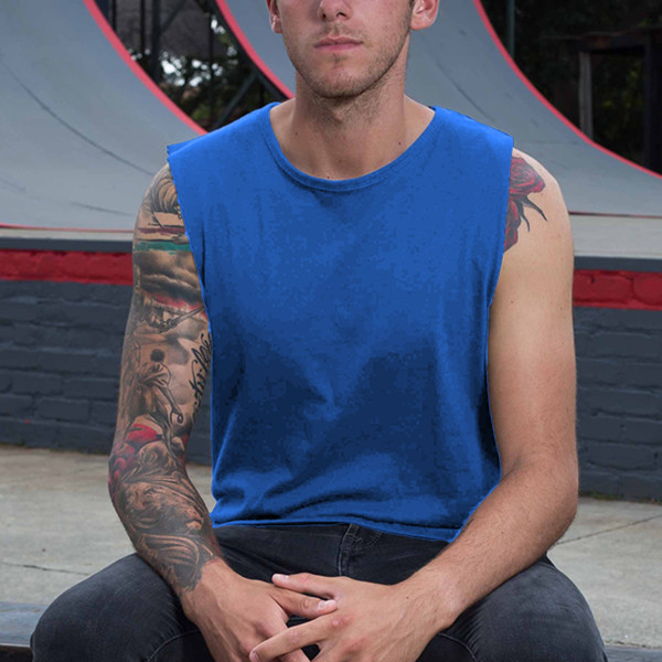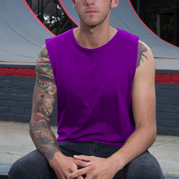 Our sleeveless T-shirt features a raw edge armhole, with binding around the neck. In the same fit as our men’s fashion fit T-shirt.